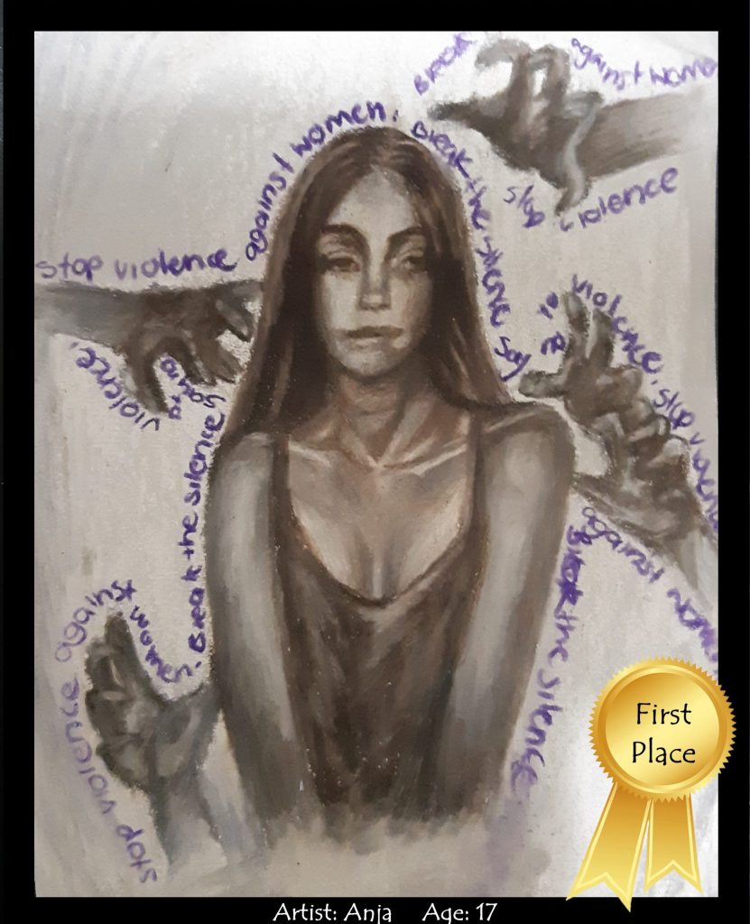 “Break the silence, stop the violence” deciphers how women suppress violence, her closed shoulders show her discomfort yet a smile remains on her face.